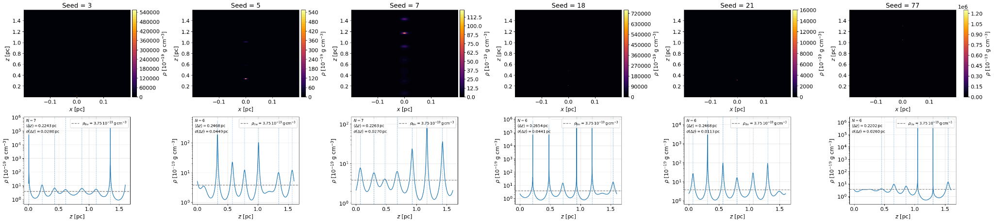 Density distributions and corresponding axial density profiles for \(Z_{\max} = 1.6\,\mathrm{pc}\) and \(r_0 = 0.033\,\mathrm{pc}\) at a time close to \(14.5\tau\), shown for the seeds \(3\), \(5\), \(7\), \(18\), \(21\) and \(77\). The upper row shows the density distribution in the \(xz\)-plane at \(y \approx 0\), while the lower row shows the corresponding axial density profiles at \(y \approx 0\). The gray horizontal dashed line marks the threshold \(\rho_{\mathrm{thres}}\) used for peak detection, and the blue vertical dashed lines indicate the positions of the counted local maxima from which the mean fragment spacing is determined.